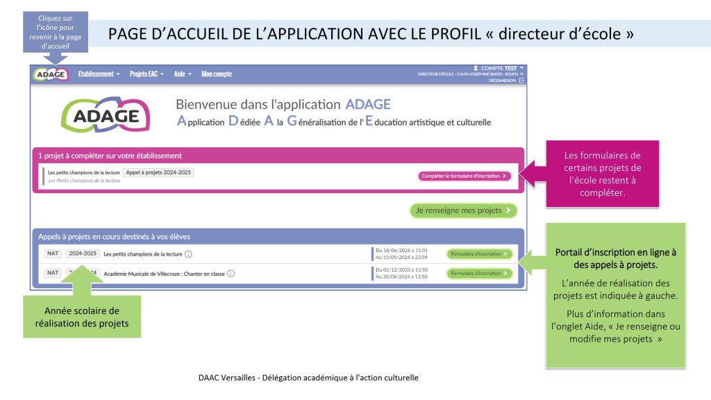 • Cliquez sur « ADAGE – Application Dédiée À la Généralisation de l’EAC » dans la rubrique « Application dédiée aux parcours éducatifs »